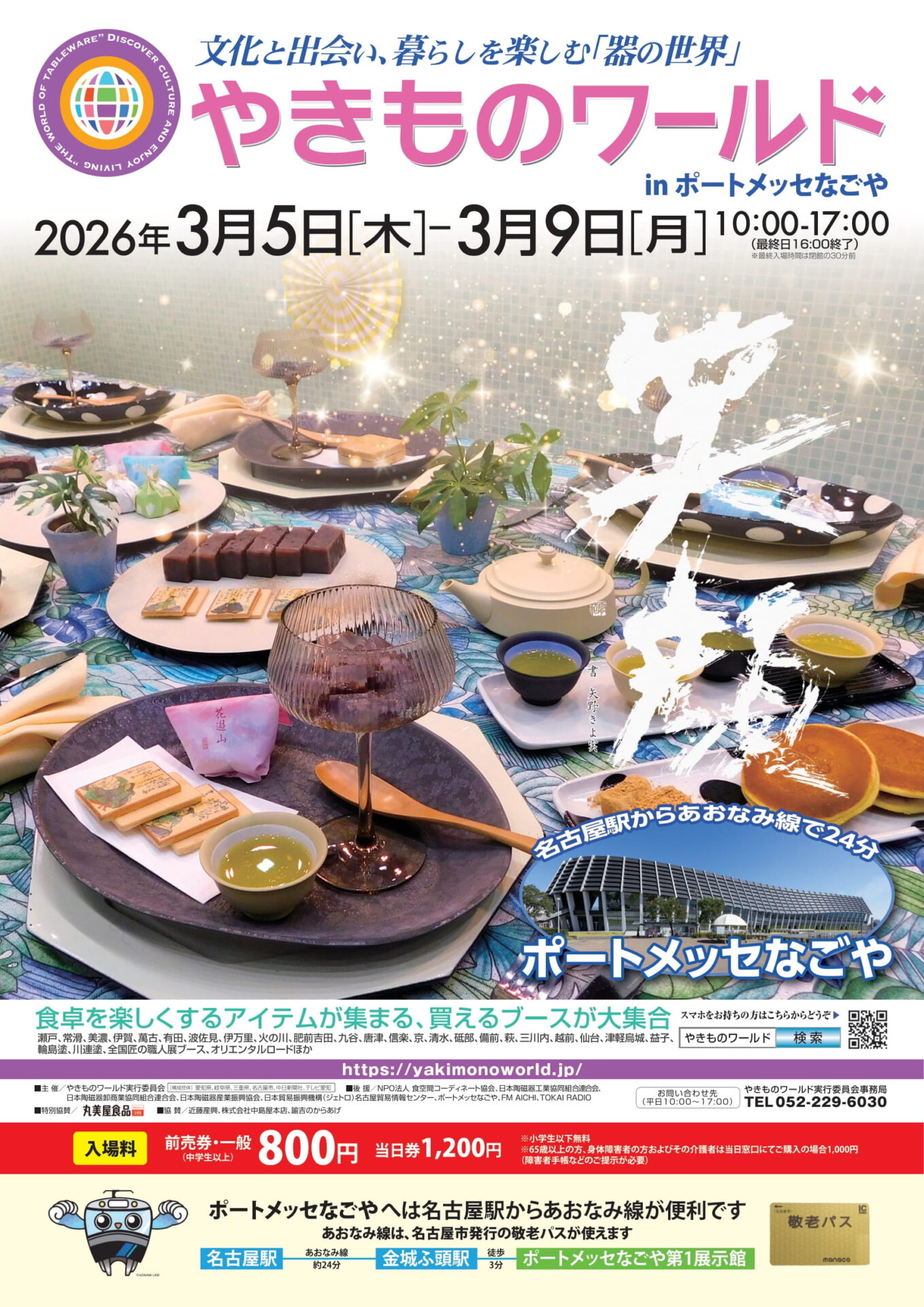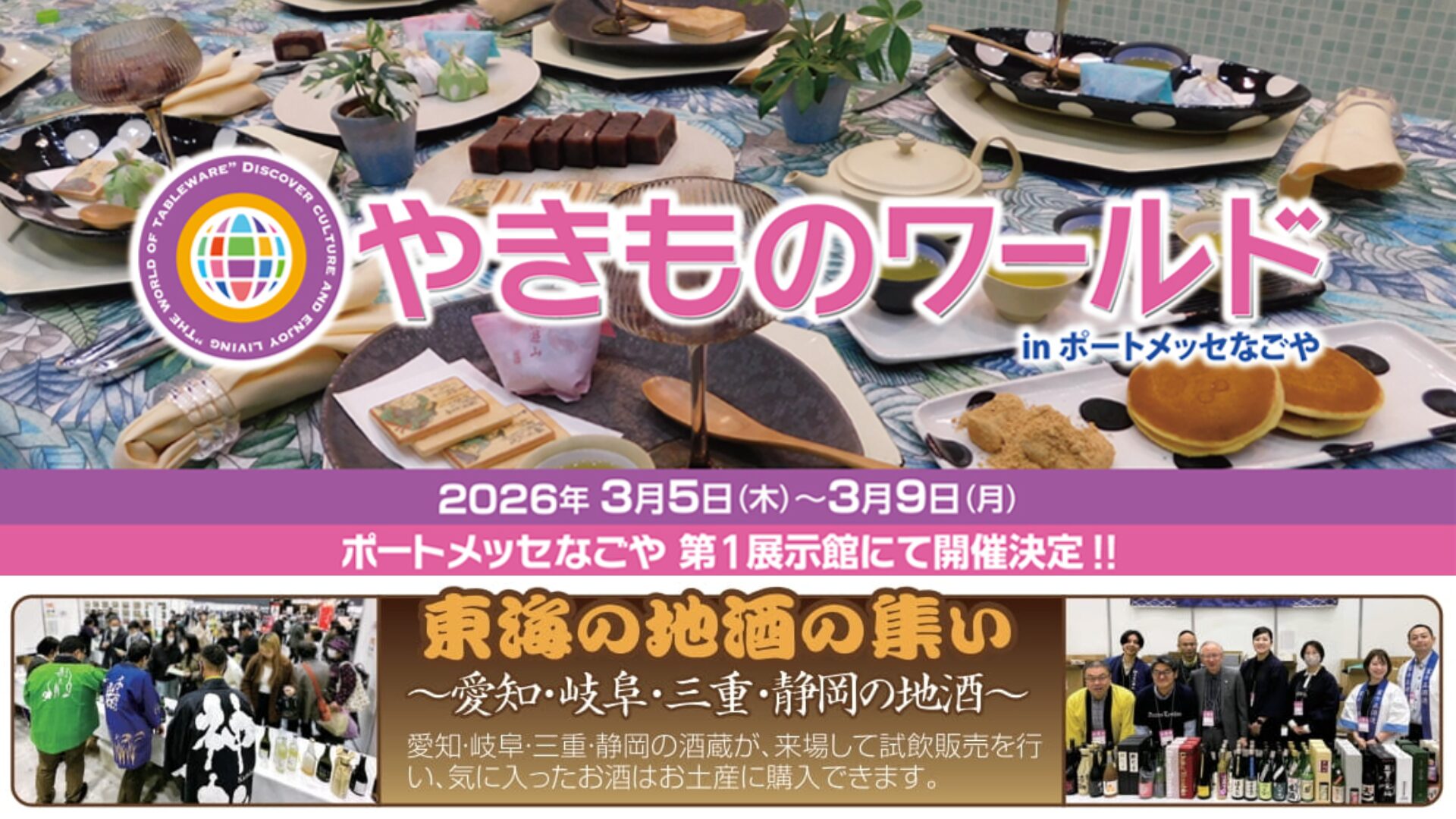 | 問合せ | <イベント開催について> やきものワールド実行委員会事務局 (テレビ愛知事務局内) 電話:052-229-6030(平日10:00~17:00) <東海の地酒試飲販売ブースについて> 委託先 クロッシング株式会社 電話:090-1981-0119 E-mail:sk@xrossing.jp |